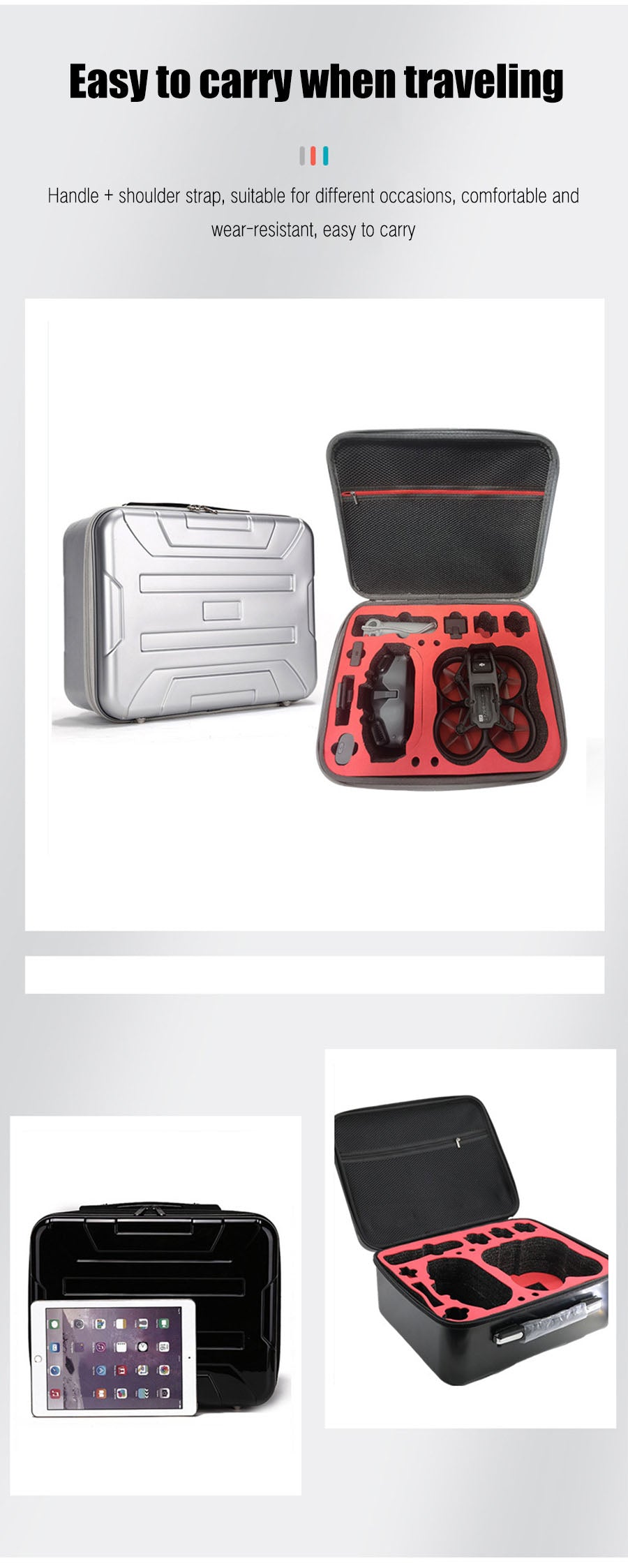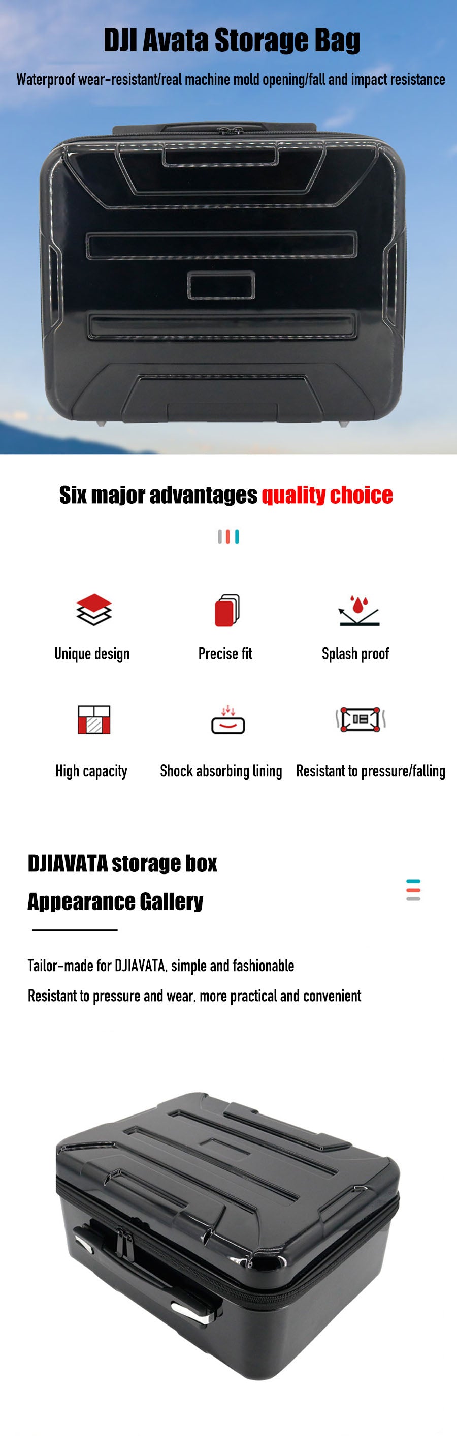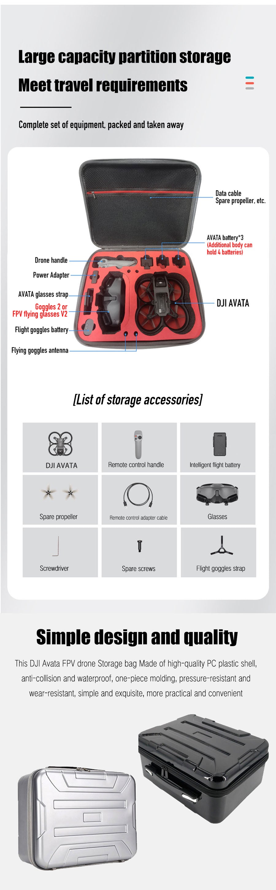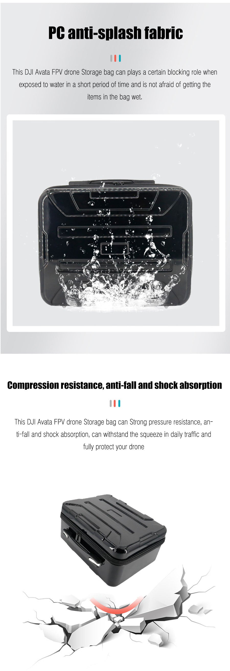 1. Simple design and quality: This DJI Avata FPV drone Storage bag Made of high-quality PC plastic shell, anti-collision and waterproof, one-piece molding, pressure-resistant and wear-resistant, simple and exquisite, more practical and convenient