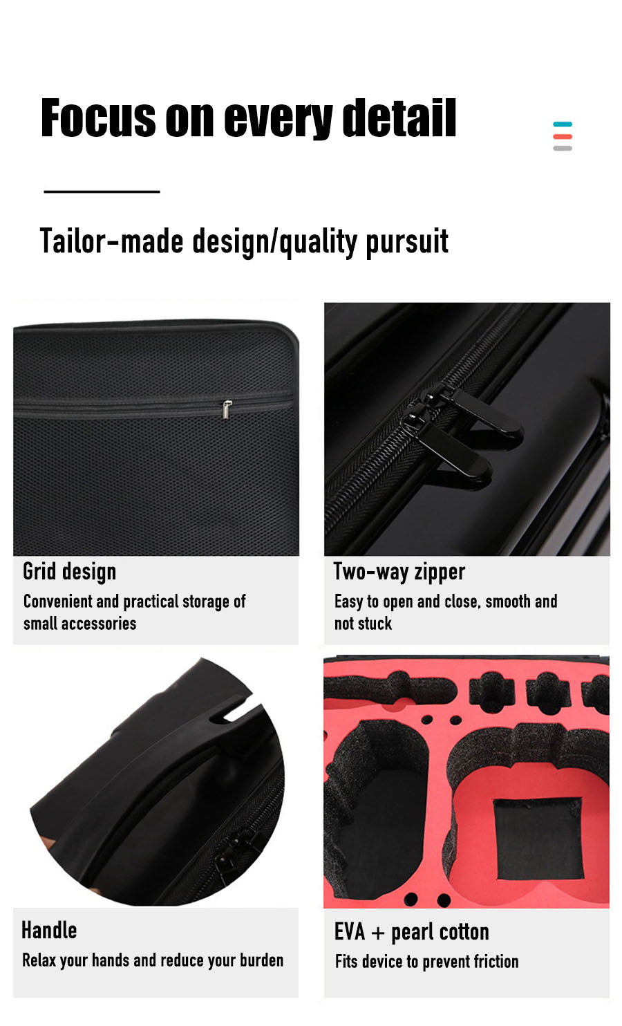 2. PC anti-splash fabric: This DJI Avata FPV drone Storage bag can plays a certain blocking role when exposed to water in a short period of time and is not afraid of getting the items in the bag wet.